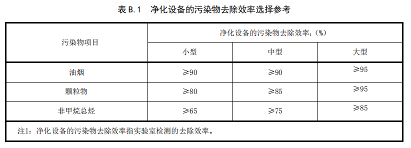 4.2.5 餐飲服務(wù)單位應(yīng)根據(jù)其規(guī)模、主要污染物等情況,選擇相應(yīng)去除效率的凈化設(shè)備,以確保達標(biāo)